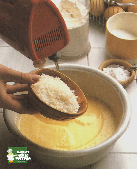 Una vez ligado todo, añadimos el Coco rallado y la Vainilla. Se continua batiendo hasta que quede todo bien integrado. Se vierte despues la leche, poco a poco, y ligamos bien.