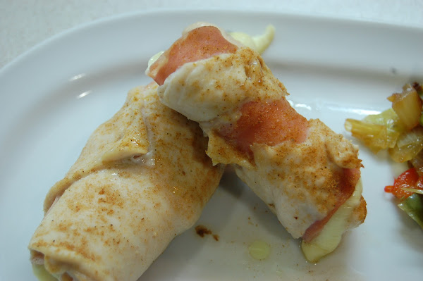 Una vez enrollado se meterá al microondas a máxima potencia unos 9 minutos por lado. Quitaremos el papel film, esperamos que se atempere un poco y cortamos (si lo cortamos recien salido del microondas puede ser que se deshaga un poco). Para la salsa de queso simplemente hay que coger nata y calentarla, luego la misma cantidad de queso y mezclar bien.