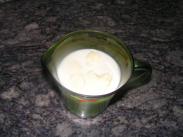 EMPEZAMOS DERRITIENDO LA MANTEQUILLA EN LA LECHE TEMPLADA, PONIENDO EN EL MICROONDAS 20 SEGUNDOS