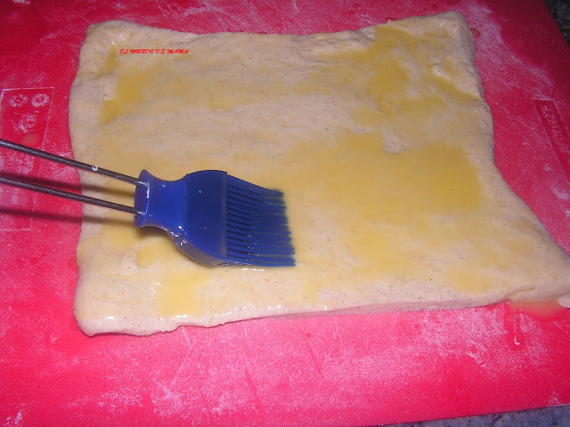 PONEMOS LA MASA Y ESTIRAMOS FORMANDO UN RECTANGULO, CON LA MANTEQUILLA LIQUIDA PINTAMOS TODA LA BASE