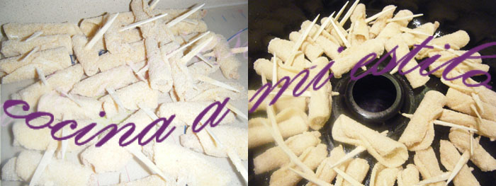 2 patatas,100g de gamba pelada,harina huevo y pan rallado para empana,salsa de soja,aceite para freirPelamos las patatas y las cortamos con la mandolina muy finita como si fuera chips, empezamos a enrollar las gambitas y cerramos con un palitopasamos por harina, huevo y pan rallado, y freimos en abundante aceite caliente