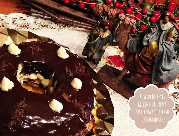 ROSCÓN DE REYES RELLENO DE CREMA PASTELERA Y CUBIERTO DE CHOCOLATE