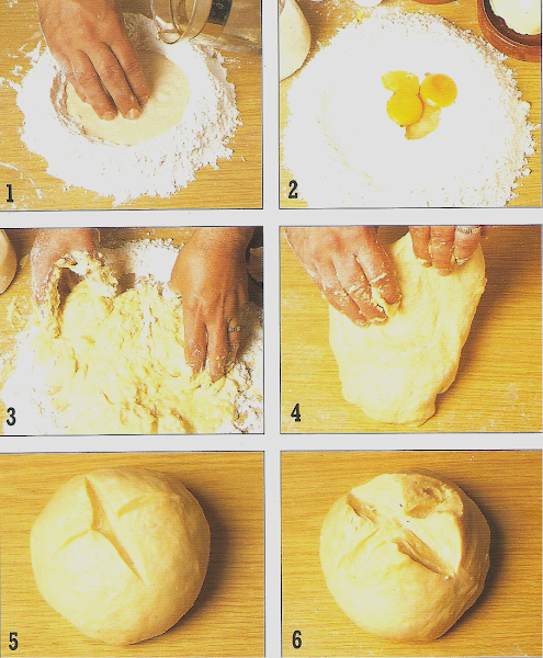 1.-Formemos la masa levadura, separar del total de la harina una pequeña cantidad y formar con ella un pequeño circulo. Disolver la levadura en un poco de agua y echar en el centro. formar una pequeña bola y dejar reposar, haciendo una cruz en la superficie