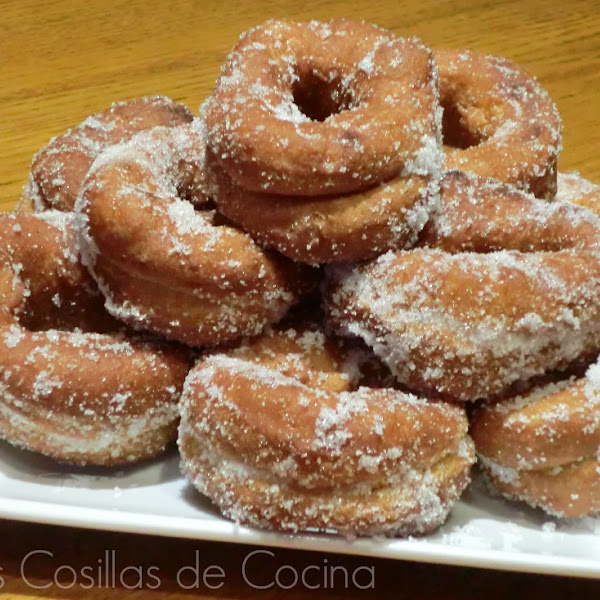 Cogemos masa y hacemos bolas del tamaño de una nuez, juntamos dos bolas una encima de la otra y con el dedo hacemos un agujero en el medio moviendo los dedos para hacer la rosquilla, freímos en abundante aceite no demasiado caliente hasta que estén bien doradas, sacamos y espolvoreamos con azúcar.