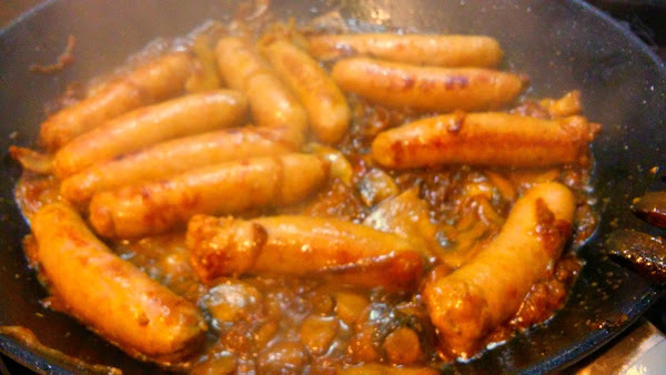 4. Deja que la salsa reduzca durante 10 minutos hasta que las salchichas estén en su punto.