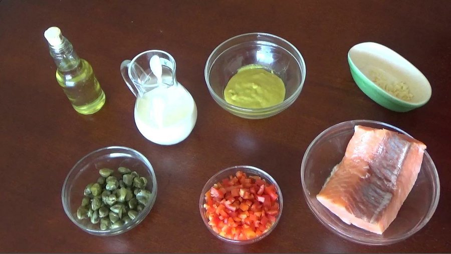 En una sartén poner el aceite y cuando este caliente se agrega el ajo, y se deja freír hasta que este dorado, luego se agrega el pimentón, añadimos la mostaza, las alcaparras y mesclamos y salpimentamos al gusto y por ultimo agregamos la crema de leche y dejamos hervir 5 minutos más.