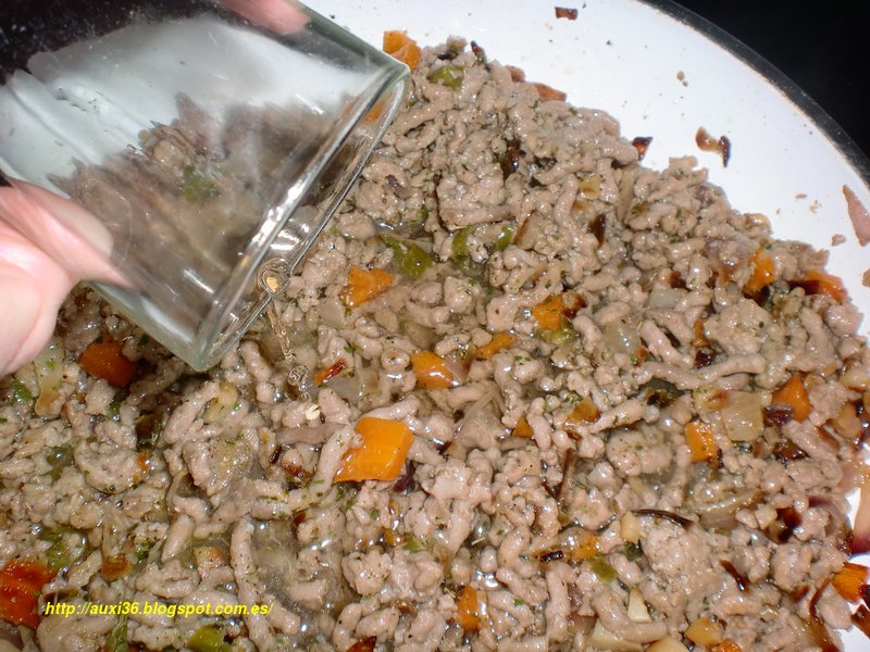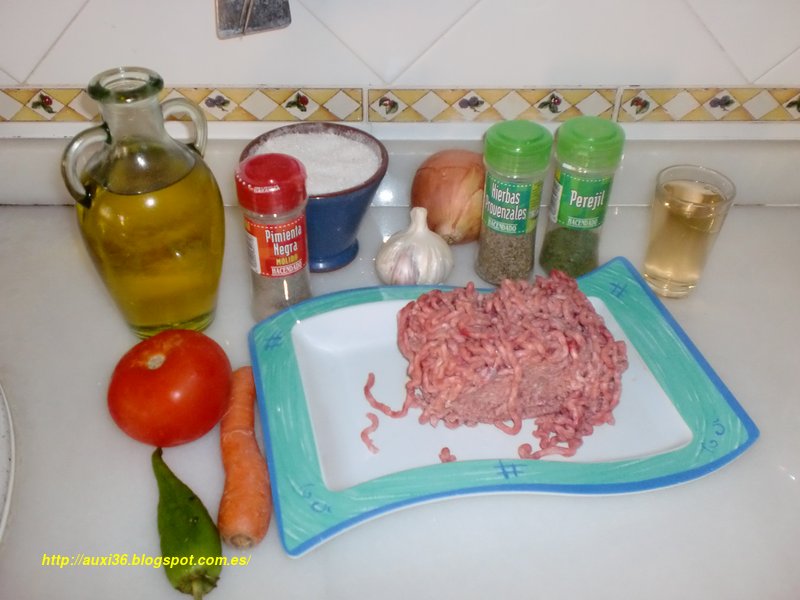 Carne picada de ternera,tomate,pimiento verde,zanahoria,cebolla,ajos,especias ,vino blanco ,aceite y sal