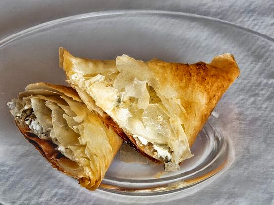 Esta es otra receta basada en una preparación tradicional pero en la que apenas se ha respetado más que la idea de una masa muy fina rellena: las samosasson una especie de empanadillatípica de las cocinas de La India y Pakistán rellenas por lo común de verduras aderezadas con curry u otras especias, y fritas. Vamos, que los defensores de la ortodoxia pueden ir cogiendo la piedras para la lapidación: estas samosas que hoy os ofrezco, primero están rellenas de queso; segundo, no llevan especias, sólo un toque de hierbas aromáticas, y para finalizar no están fritas sino horneadas. Pero el resultado es una sorprendente empanadilla con la masa crujiente, mucho más ligera que si se hubiera frito, y servida recién hecha con un relleno de fuerte sabor y suave textura aromatizado con las hierbas provenzales y el cebollino. Un aperitivo original y muy sabroso, ideal para animar una copa en buena compañía.