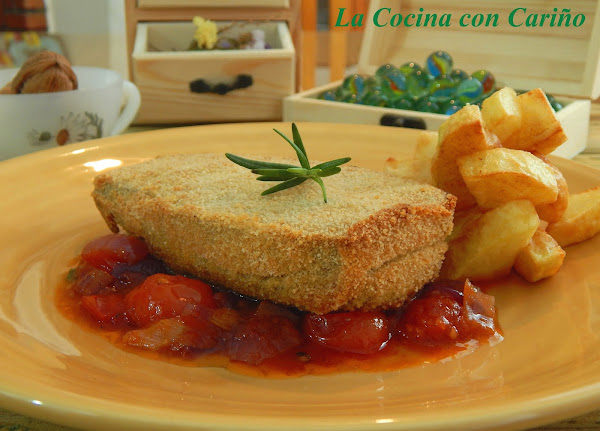 Si os fijais, en un principo antes de pasarla por harina, huevo y pan rallado yo le pinché un palillo a lo largo de brocheta con la intención de que el que quisiera se la comiera como si se tratara de un chupa chus.