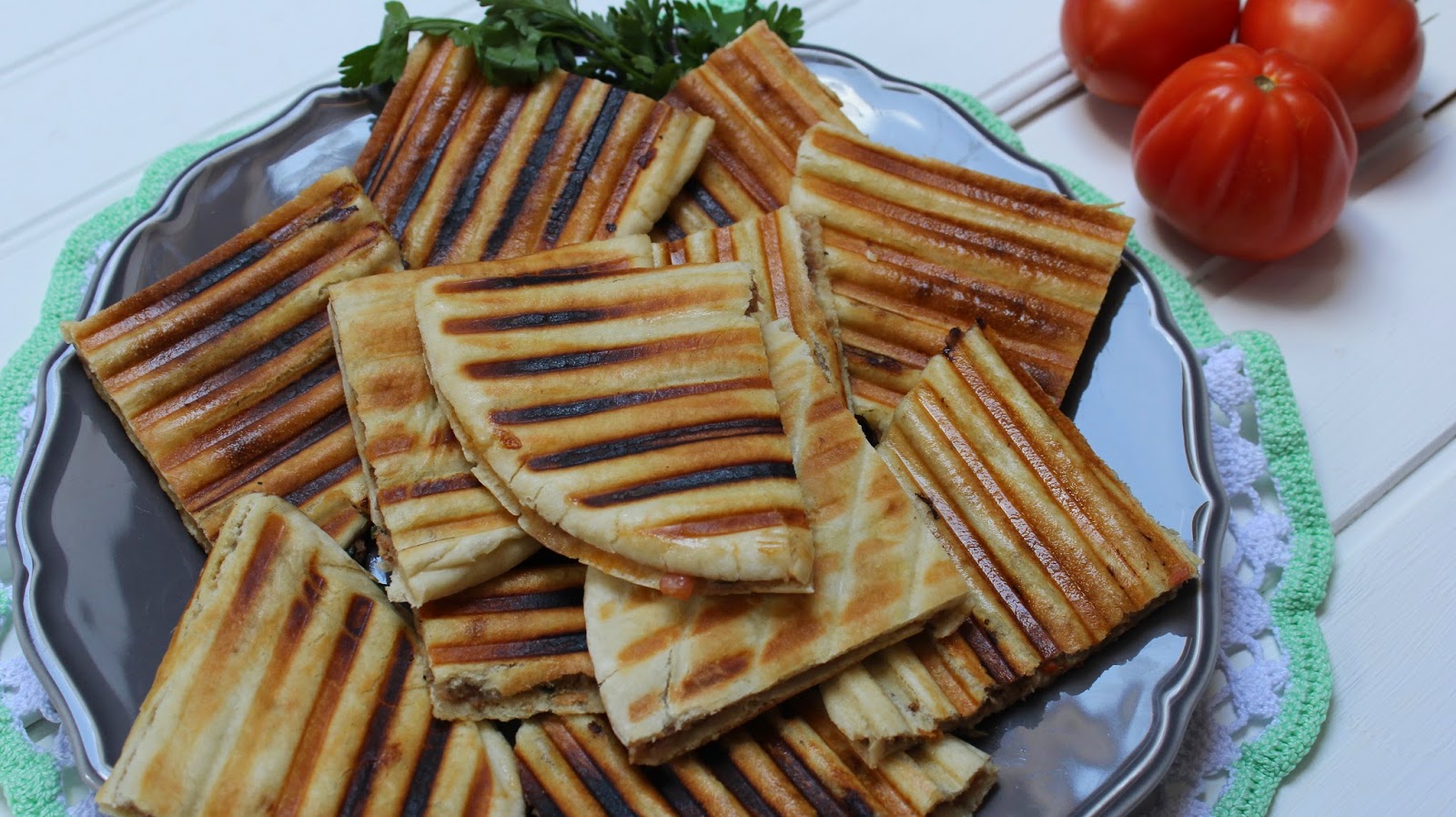 Tenía PAN PITA que había congelado del otro día y me quedaban unos trozos de CARNE MECHADA, así que le agregué un par de cositas más y nos quedo un almuerzo exquisito y fácil a preparar.
