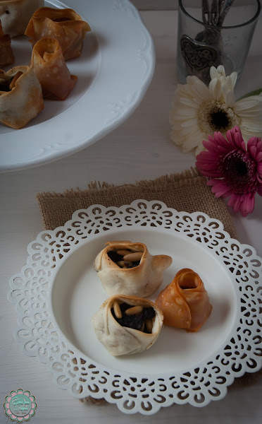 Mezclamos las morcillas con los piñones (cantidad al gusto) y con una cuchara grande que tomamos como medida vamos poniendo pegotes de mezcla sobre las obleas. Una vez repartida toda la mezcla de morcilla y piñones hacemos los saquitos con las obleas y volvemos a pintar los saquitos con el huevo batido.