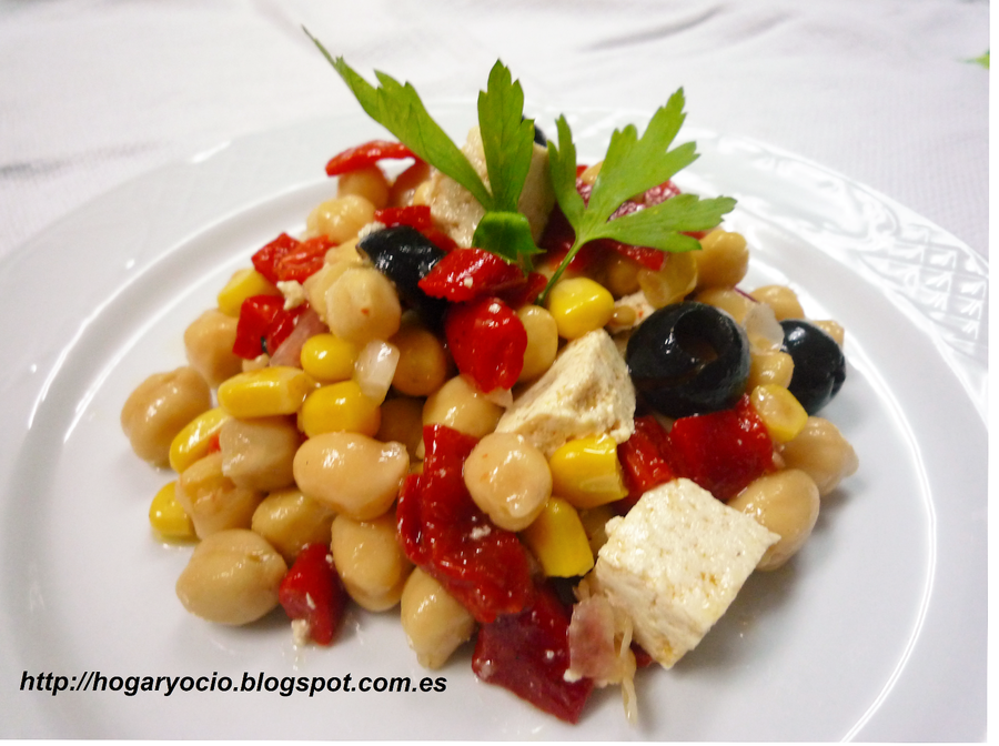 Para finalizar, os dejo otra ensalada de mi blog, esta vez con legumbres, que son muy sanas y se comen poco. Además de garbanzos cocidos y tofu, necesitaréis pimiento, cebolla, aceitunas, maíz dulce y los ingredientes para aliñar. Se trocean el tofu y los pimientos, se mezclan todos los ingredientes y se incorpora el aliño. Así de fácil y de rico.
