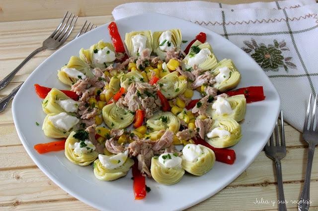 Comenzamos con una preciosa ensalada de Julia y sus Recetas, sencilla, depurativa y rica. El ingrediente estrella es la alcachofa, ya sabéis lo bien que va en las dietas, combinada con el atún que en este caso es al natural. El resto de ingredientes son maíz, pimineto y por supuesto el aliño. Solamente tenéis que disponer los ingredientes en la fuente de presentación, debidamente cortados, y luego aliñar.
