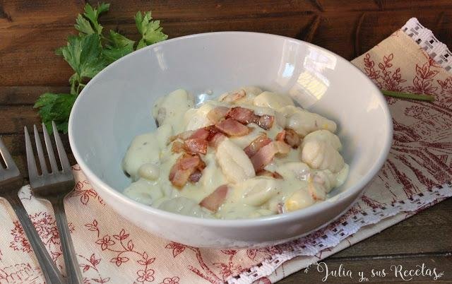 Para ver la receta completa haz clic aquí: gnocchi a los cuatro quesos y bacon.