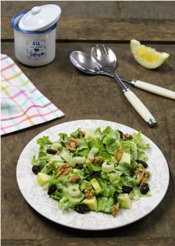 Necesitaréis lechuga, manzana, nueces, pasas y apio. Todos estos ingredientes se trocean, la manzana la rociaremos con zumo de limón para que no se oxide, y por último condimentamos con sal, pimienta y mayonesa. Todos los detalles y las cantidades las encontrarás en mi propio blog, Hogar y Ocio.