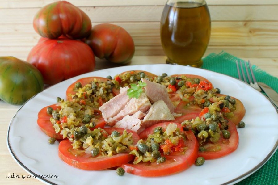 Podemos comenzar preparando la vinagreta, que se elabora triturando varios encurtidos y pimento. Luego se incorpora sal, pimienta y mostaza. En una ensaladera o bandeja se colocan los tomates en rodajas, en el centro un poco de atún y por encima la vinagreta. Así de fácil es esta ensalada, aunque para que te quede de diez te recomiendo que sigas el paso a paso tal y como lo hace Julia.