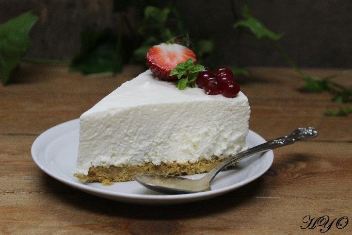 Esta mousse lleva una base de galletas trituradas con mantequilla. Para el relleno puse una mezcla de leche, huevo, queso crema, endulcorante líquido y gelatina. Y para conseguir la textura de mousse tan carácterística añadí nata montada y claras de huevo. Una vez que la tarta cuaja, solo hay que desmoldarla y decorarla, en este caso, con frutos rojos y hojas de menta fresca.