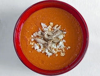 Una receta muy veraniega, un plato muy rico y nutritivo, de verdad apetecible en estos días de calor: un salmorejo. El salmorejo es una manera típica de preparar una crema fría de tomate, originaria de Córdoba, aunque también por Canarias hacen uno que es más una salsa para acompañar carnes.