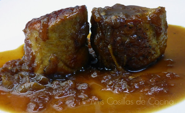 Cortamos los solomillos en medallones de unos 2 cm, salpimentamos y los freímos en una cazuela con 4 cucharadas de aceite, hacemos bien por todos lados, sacamos y reservamos.
