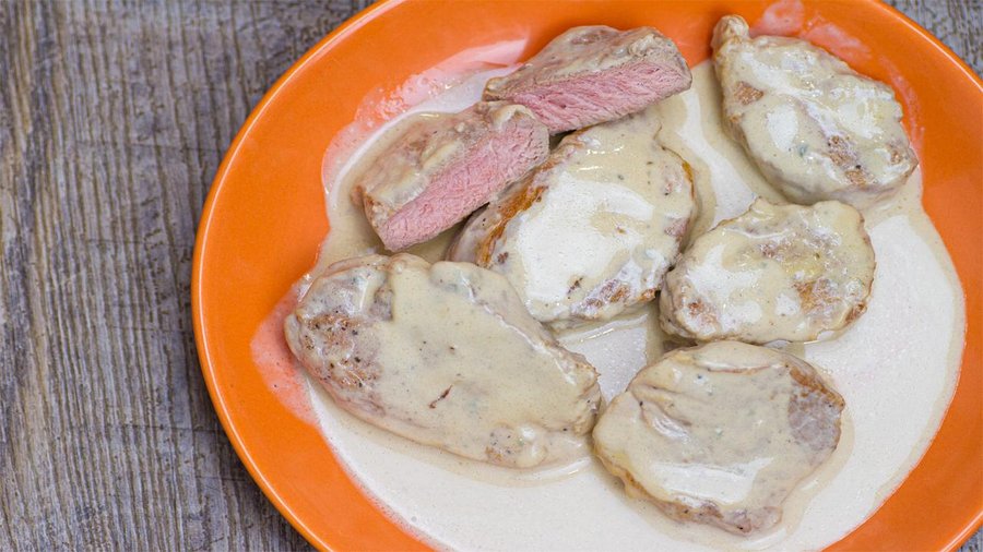 Receta super fácil, ideal para cenas rápidas y sin complicaciones. Solomillo de cerdo en salsa roquefort. También lo puedes hacer con pechuga de pollo o pavo, lomo de cerdo o solomillo de ternera.