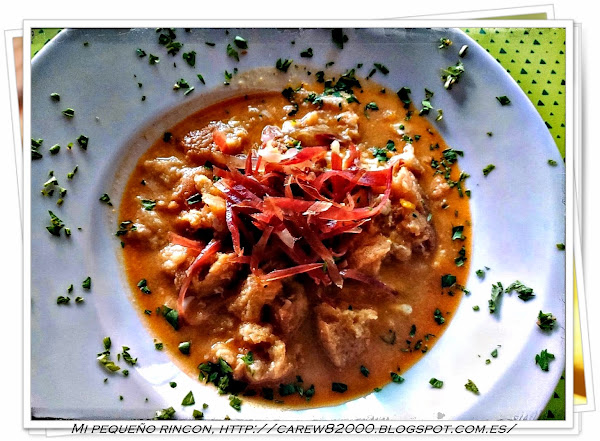Cuando están dorados añadimos una cucharada de pimentón y damos unas vueltas retirada la cazuela del fuego para que no se queme entonces echamos el agua y la sal al gusto y ponemos otra vez en el fuego, a continuación añadimos el pan en láminas y cubrimos con mas agua si la necesitamos yo echo una guindilla pequeña por que les gusta con un poco de picantito.