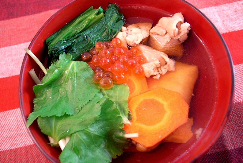 6. Añade a la sopa el mochi asado a la parrilla, el kamaboko o naruto y las rebanadas de negi en la sopa.