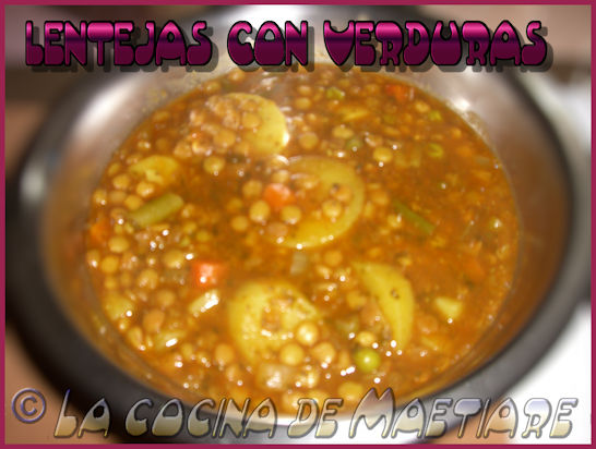 Ingredientes: 160 gr de lenteja rápida 1 patata mediana o dos pequeñas 1/2 cebolla verduras congeladas para ensaladilla rusa guisantes congelados 1,100 l de agua 20 gr de caldo de verduras en polvo 1/2 cucharadita de pimentón dulce 1/2 cucharadita de ajo en polvo 1/2 cucharadita de cebolla en polvo 3 cuch. de tomate frito Preparación: Poner a remojo las lentejas durante 1 hora Calentar el agua ...
