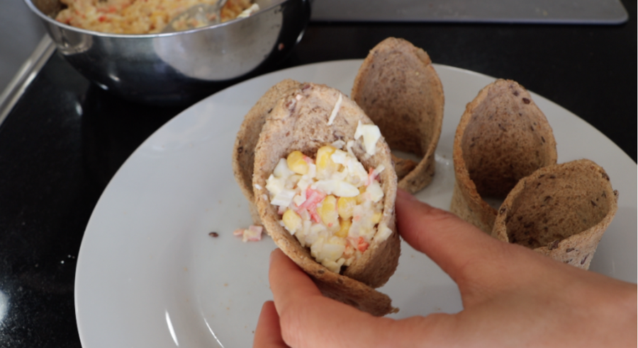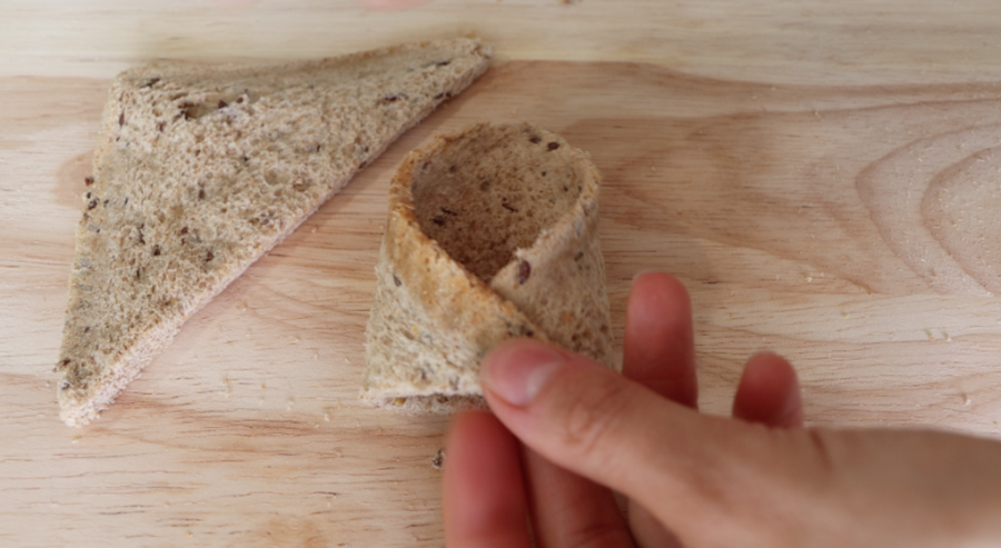 1. Extienda el pan tostado finamente con un rodillo. Corta diagonalmente en 2 triángulos. Fija los bordes del triángulo con un palillo. Hornear en microondas durante 1,5-2 minutos. Luego retire los palillos.