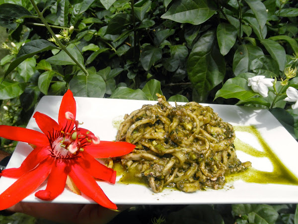 Adoro este plato. La comida Raw Food me ha enamorado. Me creerías si te digo que estos ricos spaguetti al pesto con queso parmiggiano no llevan "pasta" ni "parmiggiano"? Pues sí, así es. Este rico plato que se prepara en 10 minutos está hecho con zucchini CRUDO! (se tiempla un poco al vapor pero no se cocina) La salsa pesto está hecha con albahaca y AGUACATE y el parmiggiano está hecho con anacardos (semillas de marañon),nueces de Brasil, un poco de sal y pimienta y un cuarto de cucharadita de aceite. Absolutamente deliciosos, absolutamente saludables :-
