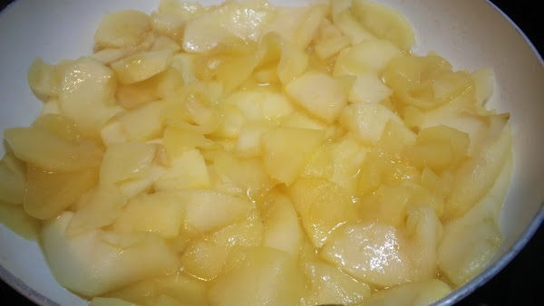 2. Calienta un poco de mantequilla en una sartén y cuando esté derretida incorpora las láminas de manzana. Remueve un poco e incorpora unos 20 grs de azúcar (que queden cubiertas). Deja caramelizar (aproxim. 15 minutos). Aprovecha para precalentar el horno a 180 grados.