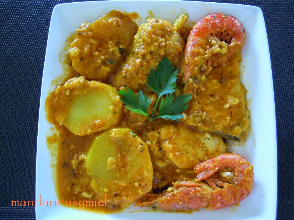 - 3 rodajas de merluza.3 cortadas de emperador (si es grande puedes partirla en dos, hay suficiente).3 colitas de rape (puede ser congeladas y también en rodajas).6 gambas o langostinos.Harina para rebozar.10-12 almendras tostadas peladas. 2 dientes de ajo.Perejil.2 tomates para freír ( o de bote triturado). Una copa de brandy.Una cucharadita de pimentón.1 cebolla.2patatas.Aceite de oliva de Artana Caldo de pescado.Azafrán en hebra (o un poco de colorante).Sal. Modo de hacerlo: