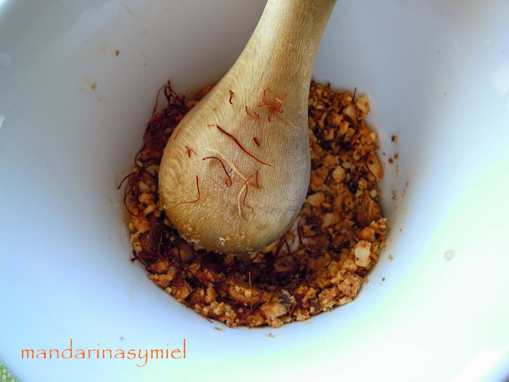 - Haz la picada de almendra, el azafrán y un poco de sal (puedes poner pan frito y hacerla más picada que la mía, pero a mí me gusta que se note).Cuando las patatas estén cocidas añade la picada, mueve la cazuela y pon todo el pescado, deja unos 10 minutos y ya está. Tiene que quedar con bastante salsa, pero no caldoso. Sírvelo caliente.