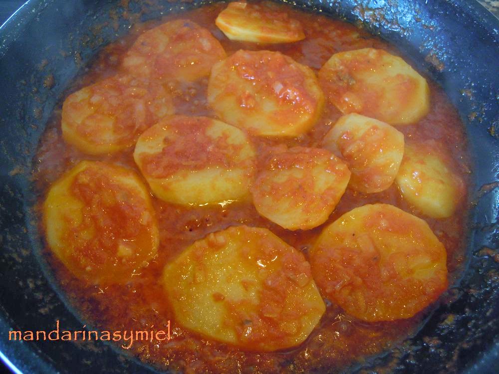 - Pica la cebolla, pela las patatas y córtalas en rodajas de un dedo de grosor.En la misma cazuela sofríe la cebolla (si te hace falta ponle más aceite), pon el tomate y fríelo todo a fuego lento. Cuando ya este casi frito pon las patatas y dales unas vueltas, echa el pimentón y mueve, ahora pon el caldo hasta que cubra todas las patatas y un poco más. Cuece todo unos 10 minutos.