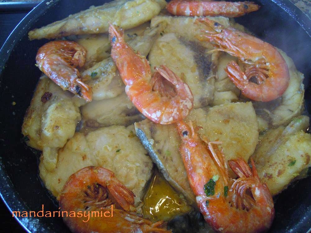 - En una cazuela grande pon el aceite a calentar.Sala el pescado y rebózalo en la harina, fríelo a fuego medio y dale unas vueltas con cuidado de que no se rompa. Hazlo por tandas, la merzluza, luego el emperador, el rape y luego las gambas.Si no te cabe todo el pescado saca tal como vayas friendo, pero no lo saques todo.Pica en el mortero los ajos y el perejil. Pon todo el pescado y echa la picada de ajo, mueve la cazuela.Añade el brandy y flambéalo, deja cocer unos 5 minutos y saca todo el pescado, deja que repose.