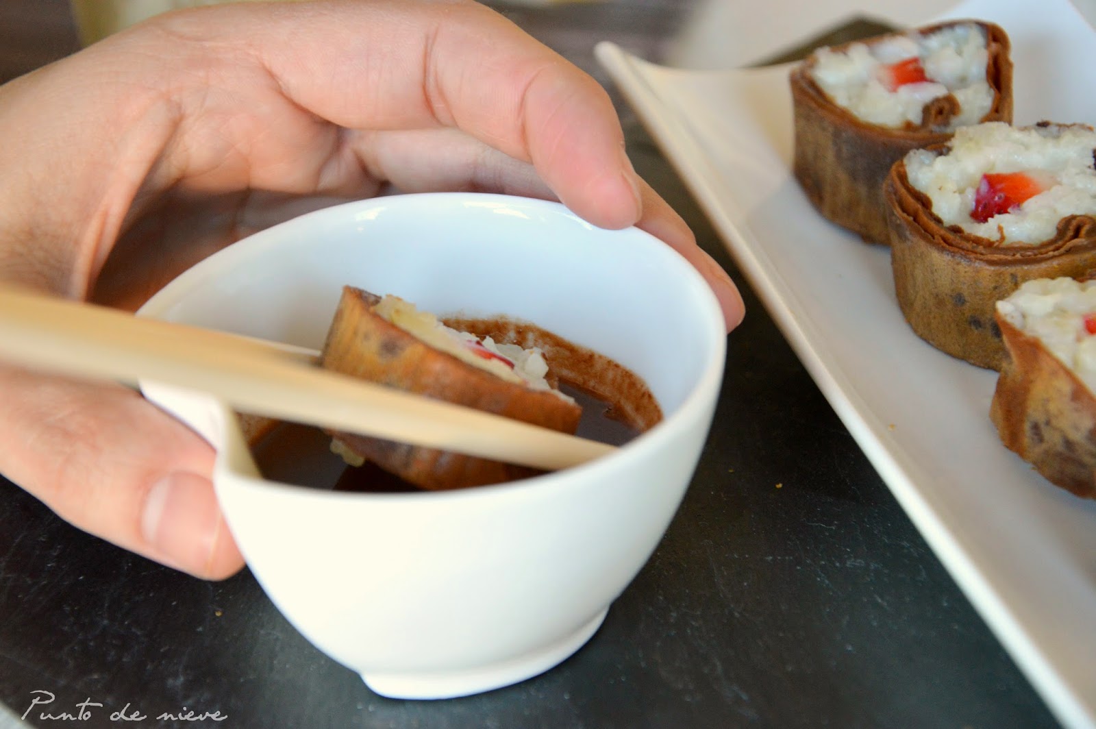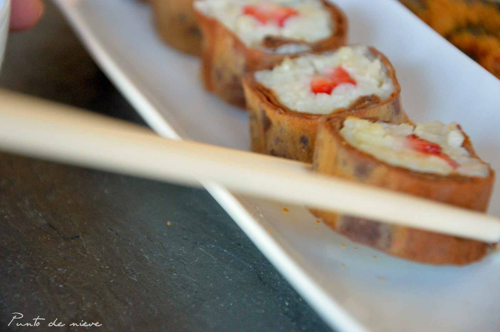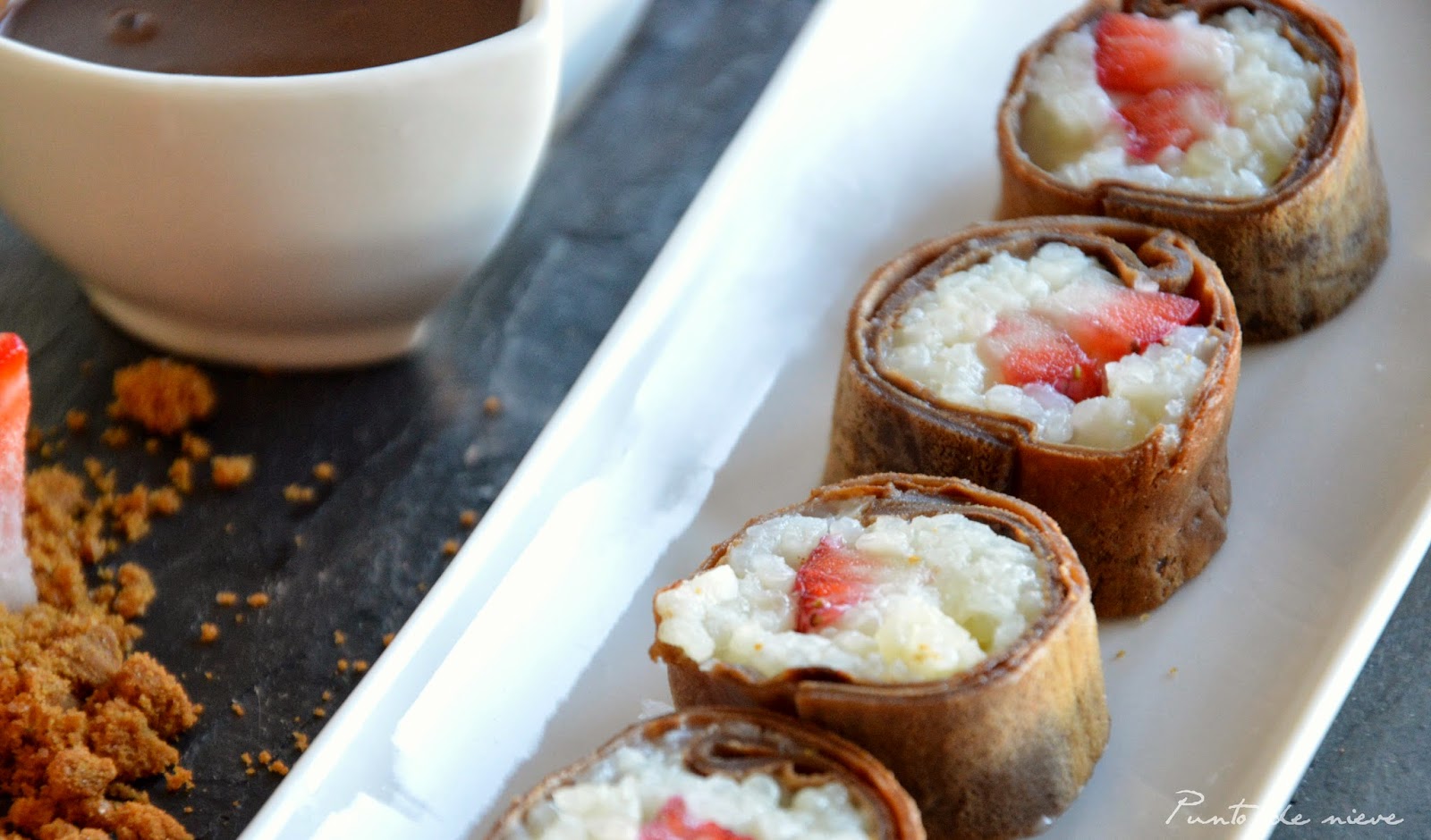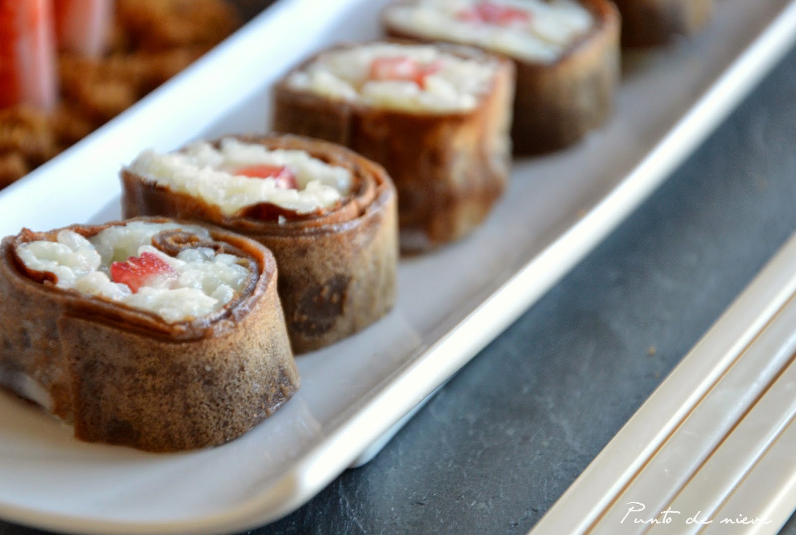En caso de que nos hayan salido crepes redondos, los recortamos un poco para que queden rectangulares (como si de una alga se tratase). Ponemos la crepe sobre una esterilla y cubrimos, un poco menos de la mitad, con el arroz. Seguramente el arroz haya quedado un poco pegajoso (es totalmente normal, no os asustéis) así que, para trabajarlo mejor, os recomiendo mojar un poco las manos con agua o leche.Cortamos la fresas en bastones finitos y los vamos incorporando en el centro del arroz como si fuese un cordón. Pegado al "cordón" de las fresas haremos otro, pero esta vez de nutella.Finalmente, lo enrollamos con la esterilla (haciendo algo de presión paga que se queden bien "pegados" todos los ingredientes) hasta formar un rulo. En mi primer intento, la crepe no se quedó bien pegada en el extremo. Mi truco fue poner un poco de nutella como si de pegamento se tratase: y ya no se despegó más!Después ya sólo queda cortar en porciones de unos 2 cm aproximadamente. Para conseguir unos cortes limpios os recomiendo ir mojando el cuchillo en agua cada vez que se realice un corte.