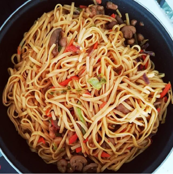Cortar los champiñones en láminas y añadir, dejar que se cuezan lentamente. Esplovorear la maicena y remover para que no se hagan grumos. Añadir el caldo, la nata, el perejil, sal y pimienta. Poner esta salsa con los tallarines que estarán cocidos al dente y escurridos. Removerlo todo junto para que se mezclen los sabores.