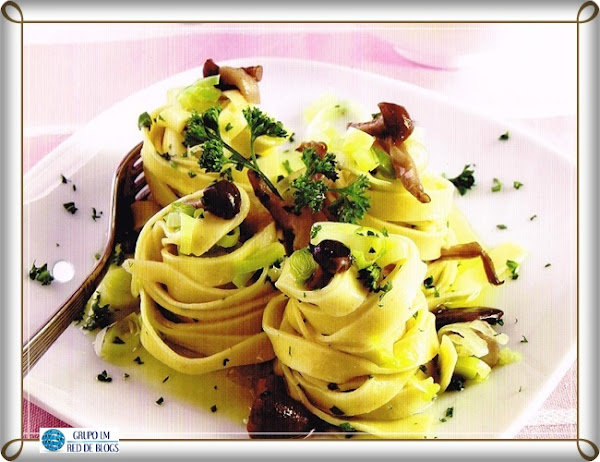 TALLARINES CON SETAS Y PUERROSRECETA DETALLARINES CON SETAS Y PUERROSIngredientes: para 3 personas. Tallarines con Setas y Puerros.-150 gramos de tallarines (Pasta fresca o, de paquete)-150 gramos de setas-2 cebolletas-50 mililitro de vino de Jerez-dos o tres cucharadas, de aceite de oliva virgen extra-3 puerros-Perejil picado-Zumo de medio limón.-SalPreparación: Tallarines con Setas y Puerros.1.- ...