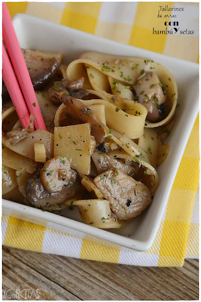 Hace poco estuve de viaje unos días, y aprovechando que fui a una ciudad más grande que la mía, me acerqué a una tienda que vendía productos orientales.Compre estos tallarines de arroz de 8mm de ancho que aquí no había encontrado. El bambú se me olvidó pero por suerte, hace poco salió en promoción en un supermercado, y me compre 3 botesPara hacer la pasta de arroz, es tan fácil como hervir agua, a ...