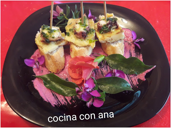 Encima de la rodaja de pan ponemos un trozo de tortilla yencima el pulpo lo pinchamos con un palillo y le añadimos un majado de aceite ajo y perejil listo ya tenemos nuestra tapa de pulpo asado espero os guste y me comentais.