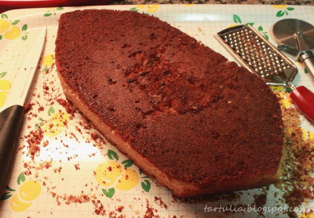 Lo hice con un molde cuadrado, mientras estaba en el horno, dibuje y recorte unas plantillas en acetato para posteriormente recortar el bizcocho, con los restos del cuerpo principal de la barca, corte las partes restantes, unté estas también con dulce de leche y también las cubrí con fondant.