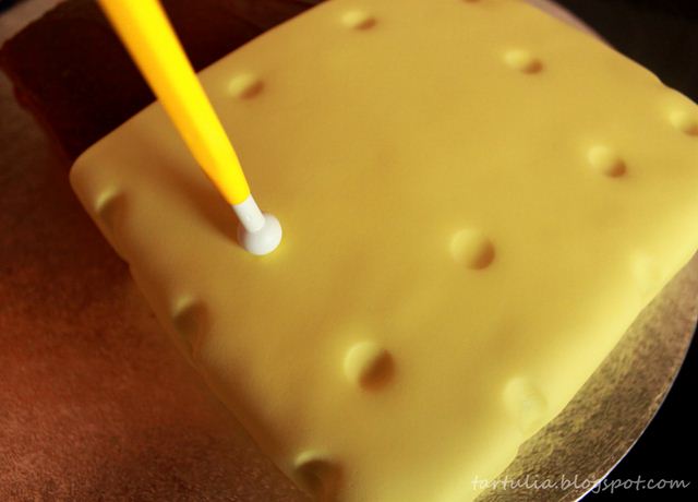 Colocamos el fondant amarillo casándolo con la línea y recortamos los bordes. Con una esteca de bolillo marcamos las hendiduras de Bob tanto en la parte superior como en los bordes.