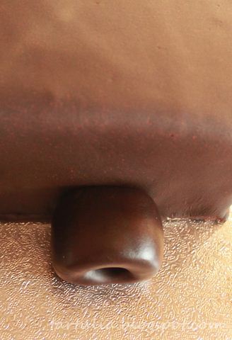 Amasamos fondant de chocolate negro o bien teñimos fondant con marrón oscuro para la parte inferior del cuerpo de Bob, yo opte por fondant de chocolate. Casamos de nuevo, esta vez con la línea del amarillo, ajustamos a la tarta y recortamos bordes.