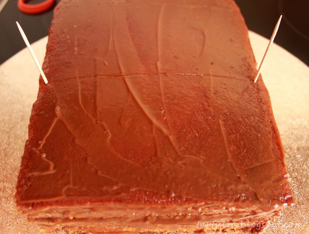 Yo marco las líneas sobre la tarta para que queden exactas y no haya desviaciones ya que una vez puesto el fondant sobre el bizcocho no hay vuelta atrás. En este caso al estar untada de dulce de leche quedaba totalmente a la vista la línea, pero aun así siempre mantengo los palillos de referencia.