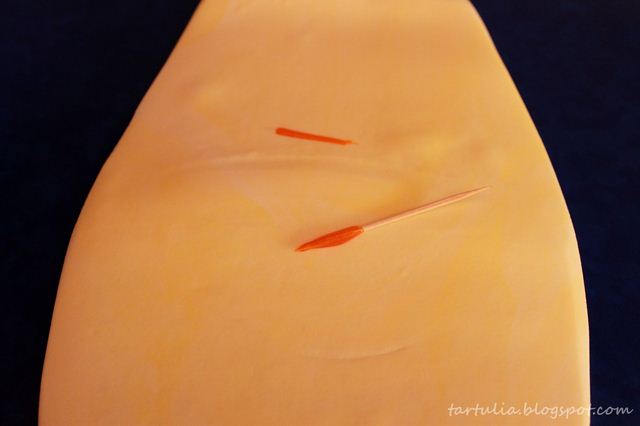 Tomamos la cantidad necesaria de fondant para cubrir la parte mas ancha de Bob, con un palillo untamos con colorante amarillo.