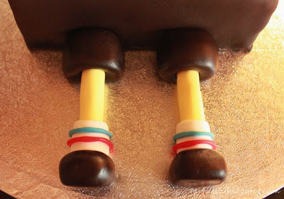 Modelamos los zapatos con fondant de chocolate, los colocamos en la base de las piernas e introducimos en las bolitas que habremos pegado a la tarta en forma de perneritas del pantalón.