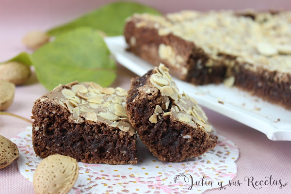 Al cortar se ven los cuadritos, es una versión sin gluten del que ya os puse hace un tiempo según se ve en el enlace, asi los celiacos también pueden comer tarta a cuadros con chocolate, esta vez con sabor a almendra.