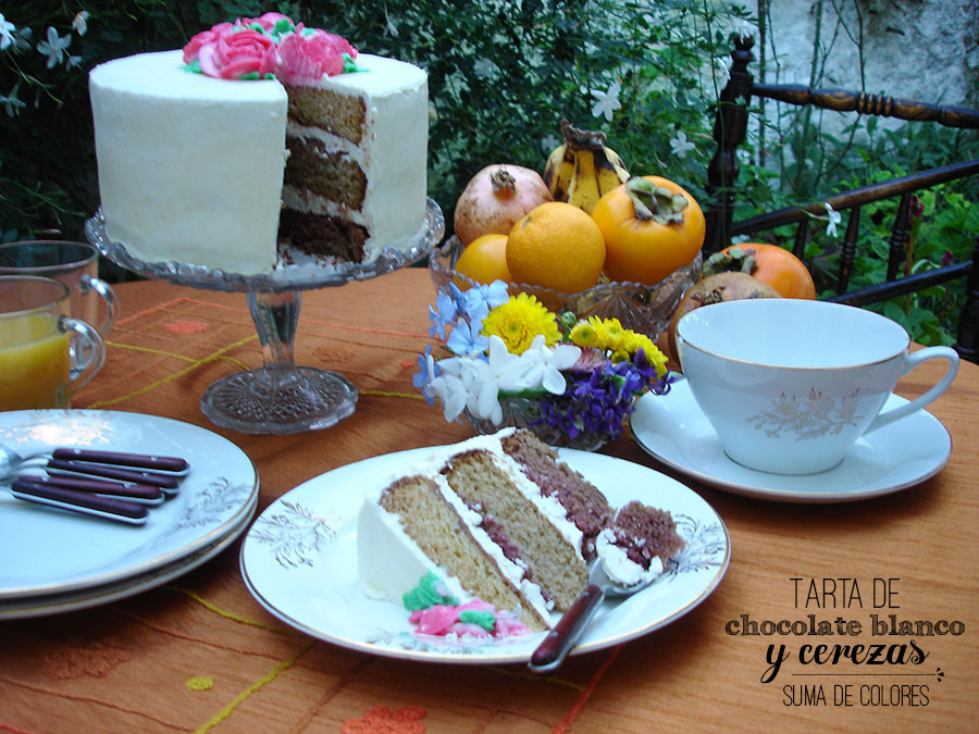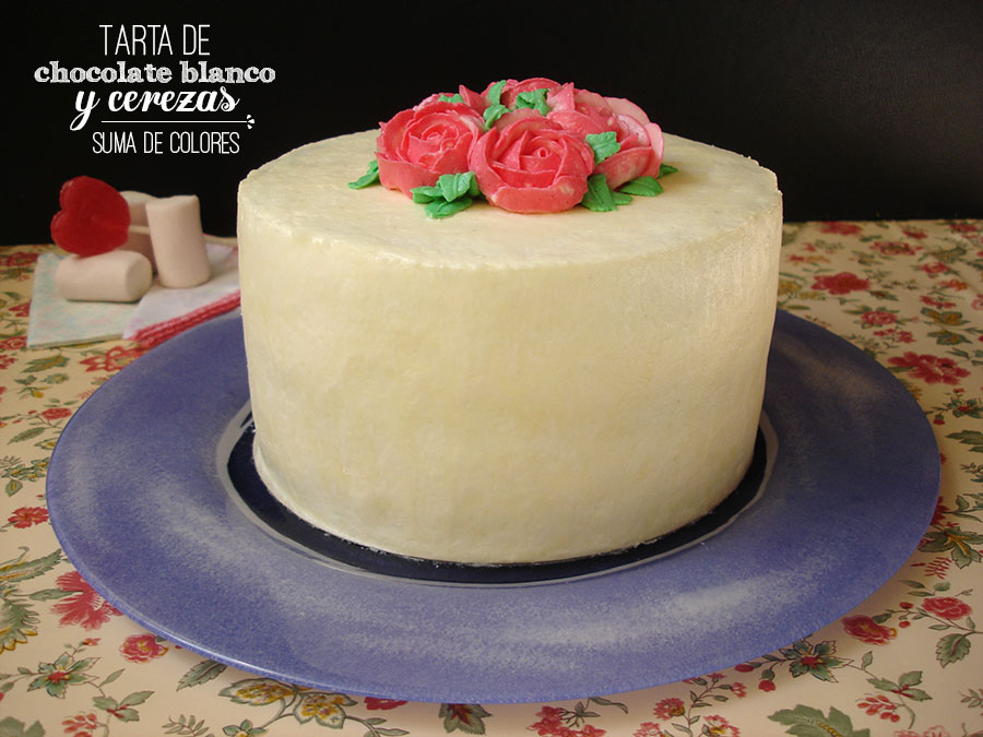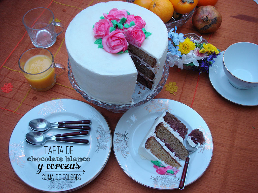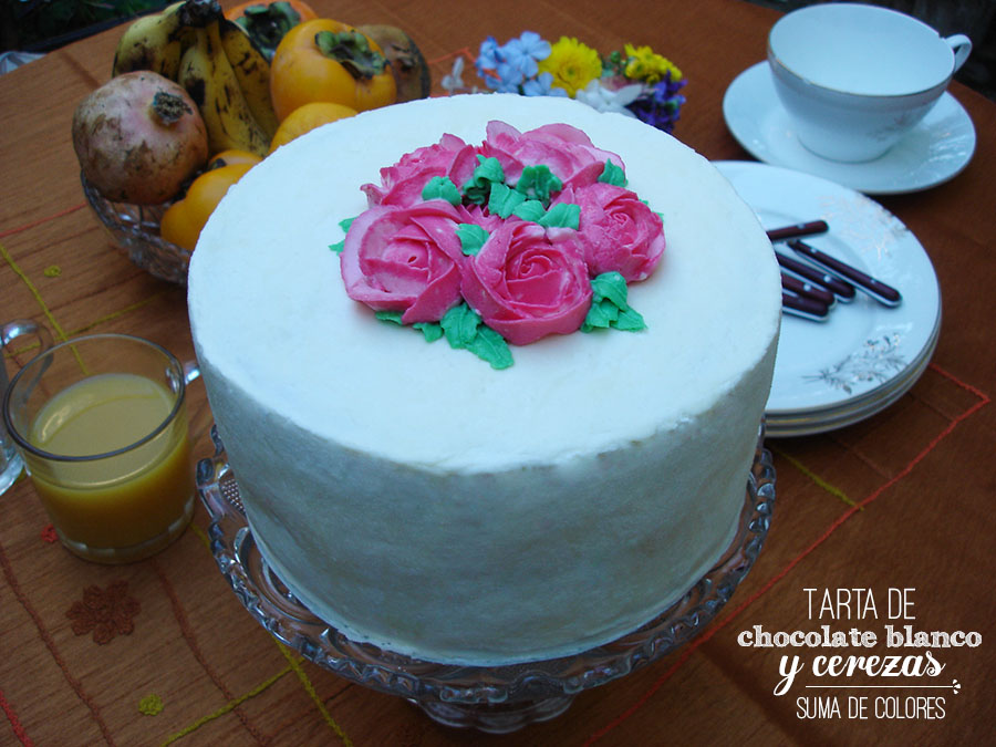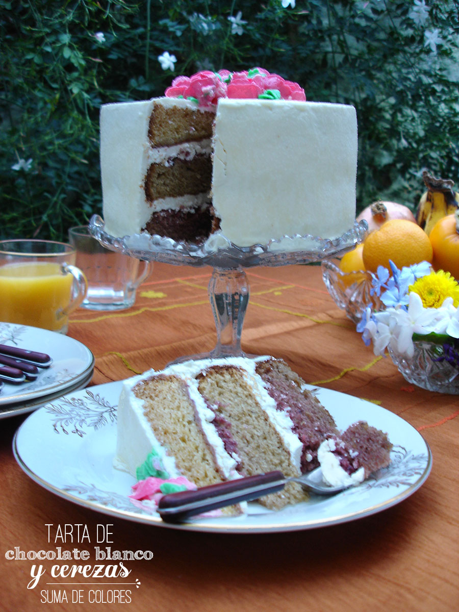 Finalmente, como las últimas semanas me ha ido bien adaptando recetas… me atreví a hacer una “mezcla” de esas dos recetas para crear mi propia tarta de cerezas y chocolate blanco con buttercream de merengue suizo.