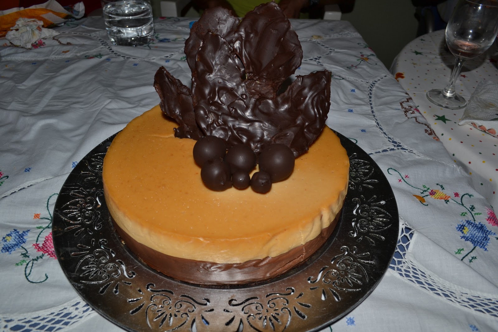 Se adorna a nuestro gusto, yo cogí unas uvas las pinche con un palillo y las unte de chocolate fundido y, las inserté en un trozo de pan duro hasta que se secaron y, las hojas son de higueras, las mías muy grandes, pero no conseguí más pequeñas y, llegaba la noche buena, no me quedaron muy bien, pero bueno las próximas las busco con más tiempo, se bañan de chocolate por un lado cuando se sequen, por el otro y, a la nevera para que se endurezcan. También podemos hacer figuras de chocolate sobre papel vegetal .