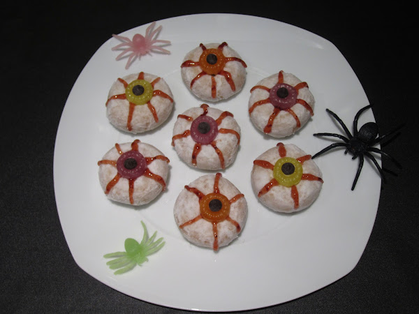 A pocos días de Halloween, os propongo un idea dulce para la noche del 31, unos terroríficos ojos sangrientos.Una receta sencilla, sin fondant ni glasa, con ingredientes fáciles de conseguirINGREDIENTES-Donettes nevados-caramelos redondos, yo utilicé caramelos doble Virginia-pepitas de chocolate-mermelada de fresaLa "sangre" de los ojos la haremos con la mermelada de fresa, para ello, la pondremo ...