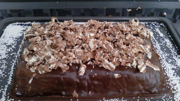 1 tableta de chocolate negro para postres, 6 huevos, 6 cucharadas de azúcar, 1 cucharada bien grande de mantequilla, galletas, leche y virutas de chocolate, lacasitos, m&m...